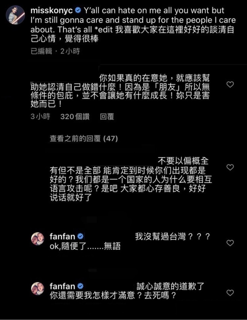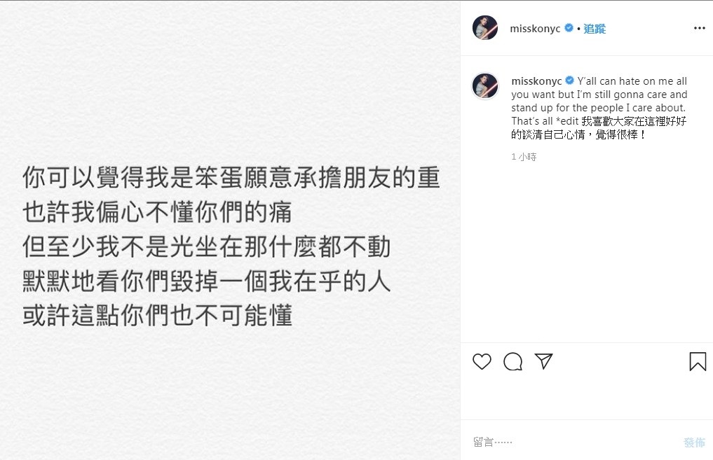 並接著說,「我知道現在是個敏感時刻,但什麼時候不敏感?這不代表你可以跟其他人一起對她丟石頭!台灣人不是很善良?怎麼會把人攻擊成這樣?拿出一點良心來做人吧!相較於人云亦云,請你們用心思考!」