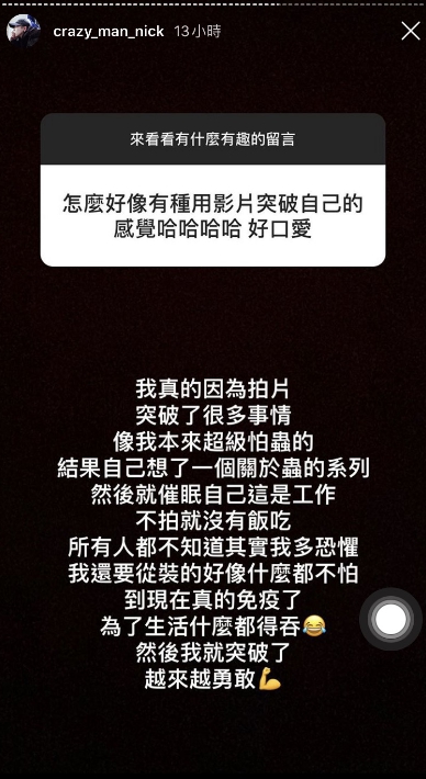 另外,Nick也在限時動態中,和粉絲們分享自己的「拍片生活」,他提到為了拍影片,突破了非常多事情,例如過去他非常怕蟲,結果自己卻想了一個關於「蟲」的系列,接著催眠自己這是工作,不拍就沒有飯吃!再多的恐懼Nick也一臉從容帶過,可見他對工作的敬業、勇敢,粉絲們也更加期待未來瘋男會有更狂的企劃,更好的發展!