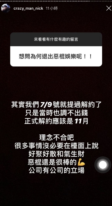 Nick日前在限時動態中開放問答,不少網友十分好奇瘋男是否退出惡棍娛樂?原因又是什麼呢?Nick對此也大方回覆,證實11月時正式和公司解約,其中也提到離開原因是「理念不合」,不過Nick也表示,公司有公司的立場,很多事情沒必要在檯面上說,認為好聚好散和氣生財最重要,最後Nick也稱讚惡棍還是很棒,可見解約一事是和平解決。