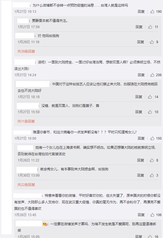 藝人賈靜雯經常會在社群平台上跟網友們互動、曬女兒,讓粉絲們對她總是特別有好感!沒想到最近卻因過年時沒有在微博祝賀,加上「武漢肺炎」爆發之後,她也沒有發聲提醒大家注意防疫,也完全沒有更新社群,讓中國網友氣到出征,留言痛批她「到中國賺人民幣,又想討好台灣,真的是雙面人!」如今,她4日發文透露,「自己其實正在生病,已經完全失聲3天了!」