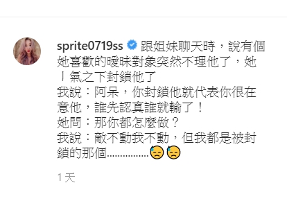 外遇風波爆發後瞬間引起軒然大波,對此雪碧不畏謠言持續更新IG近況,日前,她在IG上傳穿著女僕裝的性感辣照,同時大談愛情觀,指出與姊妹聊天時發現「她喜歡的曖昧對象突然不理他了,她一氣之下封鎖他了」,讓雪碧驚呼「封鎖他代表你很在意他,誰先認真誰就輸了!」,不禁讓對方反問「那你都怎麼做?」,她自嘲地表示「敵不動我不動,但我都是被封鎖的那個……」
