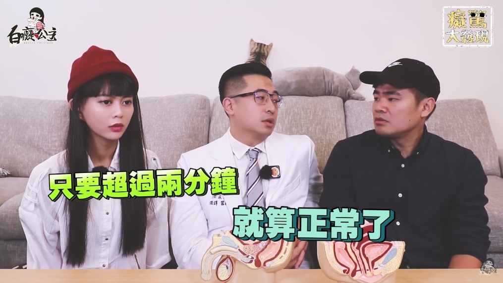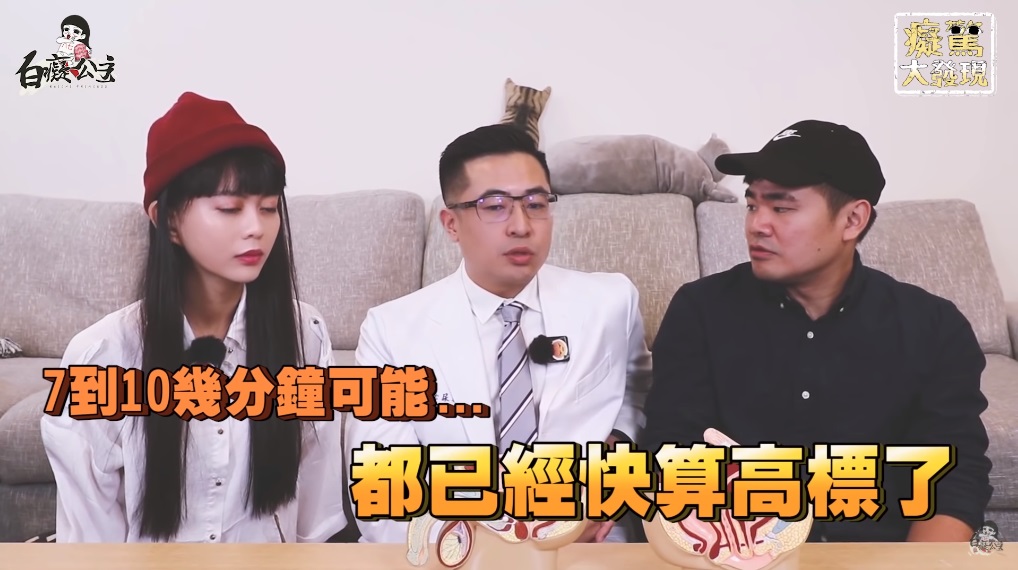 接著白癡公主還提出了許多泌尿科相關問題,提到男性「割不割包皮的差別」時,蔡哥順道指出網路上相傳男性在性行為時,能維持三十分鐘都只是「謠言」,一般來說七到十分鐘已經很厲害了,這時張醫師直呼「七到十幾分鐘可能…都已經快算高標了」,接著強調一般男性「只要超過兩分鐘就算正常了」,引起網友熱烈討論。