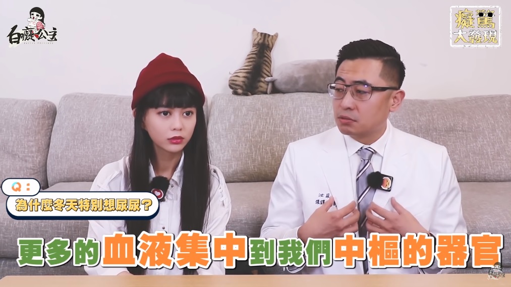 日前,白癡公主更新Youtube頻道《癡驚大發現》系列,特別邀請網紅「蔡哥」與泌尿科張醫生討論常見的幾個健康問題,影片最初先向觀眾們介紹泌尿科治療範圍包含男女泌尿系統、男生生殖系統與腎臟等系統,向觀眾解惑原來冬天特別想尿尿,是因為天氣比較冷導致皮膚的血量會比較少,「更多的血液集中到我們中樞的器官」,身體製造的尿量比夏天更多,相較於夏天還可以透過排汗排除,所以乍看之下冬天會比較常跑廁所。
