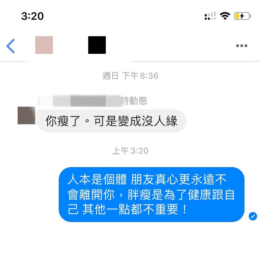 不過小甜甜沒有理會網友的留言,繼續開心地跟大家分享她的美照!直到前幾天,她收到網友的私訊說,「你瘦了!可是變成沒人緣!」聽起來會讓人感到不開心,不過小甜甜非常有自信的回說,「人本是個體!朋友真心更永遠不會離開你,胖瘦是為了健康跟自己,其他一點都不重要!」用自己的正能量來化解網友的批評。