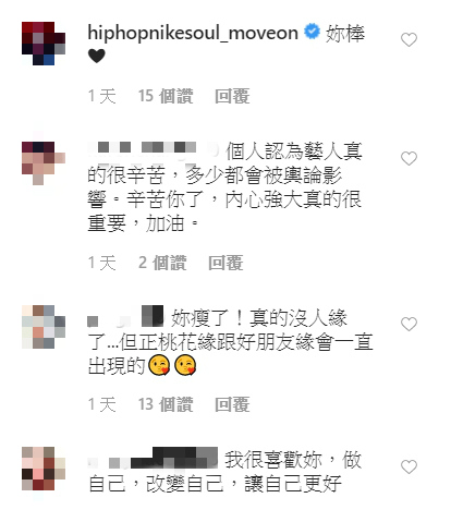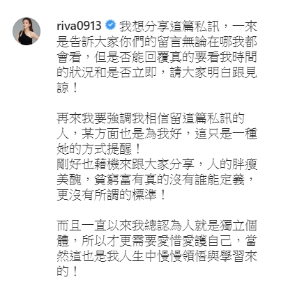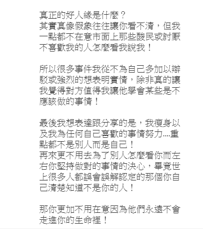 近日,小甜甜在IG上傳網友私訊她「妳瘦了。可是變成沒人緣」,面對粉絲負能量她大器回應「人本是個體,朋友真心更永遠不會離開你,胖瘦是為了健康跟自己,其他一點都不重要!」的對話截圖,她強調與大家分享這篇私訊是為了告訴大家「你們的留言無論在哪我都會看」,但能不能回覆要看她當時的時間與狀況,另外就是她相信這位網友「某方面也是為我好,這只是一種她的方式提醒」。