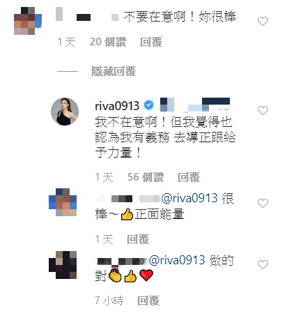 面對網友負評小甜甜大方應對,更粉絲留言表示「不要在意啊!妳很棒」,對此小甜甜親回「我不在意啊!但我覺得也認為我有義務,去導正跟給予力量!」,她一連串滿滿正能量回覆獲得網友一致好評「說的好,支持妳!」、「辛苦妳了,內心強大真的很重要,加油」、「蠻無聊的~故意吸引妳吧」。
