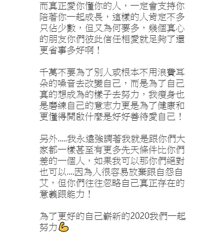 小甜甜接著強調,人生漫長她學到「人就是獨立的個體,所以才更需要愛惜愛護自己」,所以她「瘦身以及為任何自己喜歡的事情努力……重點都不是別人而是自己!」,她補充面對他人的酸言酸語不需要放在心上,要相信真正愛你與懂你的人一定會支持你成長,不會輕易批評或厭惡你,接著在文末鼓勵粉絲「為了更好的自己嶄新的2020我們一起努力」。