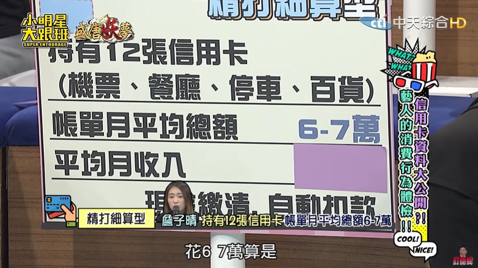 相信大家一定都會很好奇,看藝人們每天都光鮮亮麗的在螢光幕前,到底他們一個月的薪資大概會是多少吧?最近《小明星大跟班》邀請到了詹子晴、派翠克、海產、賴薇如、Paul、詹惟中等人,一起到節目上跟大家分享自己的理財行為,其中丫頭月入20萬,平均月花6、7萬,還透露自己很常不小心刷爆信用卡,沒想到竟收到「刷爆禮」,讓眾人驚訝到不行!