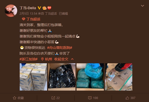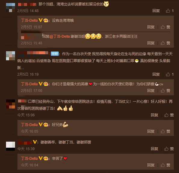 日前,丁噹在微博發文表示「清關到家,整理後打包裝箱,謝謝好朋友的幫忙,謝謝我們家物業小姐姐陪我一起清點,謝謝快遞的小哥哥」,並且強調「貨物很快抵達舟山普陀醫院,院長及各位白衣天使們,辛苦了!浙江加油。」,同時附上「一箱裝著100個口罩」、將近10箱的照片,為了幫助老家的醫護人員一口氣寄出將近「1000個」口罩!