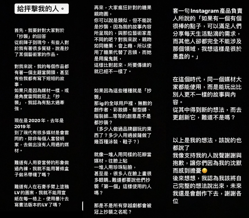 然而針對抄襲事件,鐘苡綾過去就曾在限時動態中做出回覆,她認為自己的作品都有一個主題當開頭,且某些作品還有短短的故事,「如果只是因為媒材一樣,或是角度雷同就冠上抄襲,我認為有點太過牽強。」如今抄襲一事又被拿出來討論,鐘苡綾也堅持走在自己的創作路上,「你們花時間罵我,就是等於給我越多創作的題材,讓我有機會寫出跟以往不一樣的文章」。