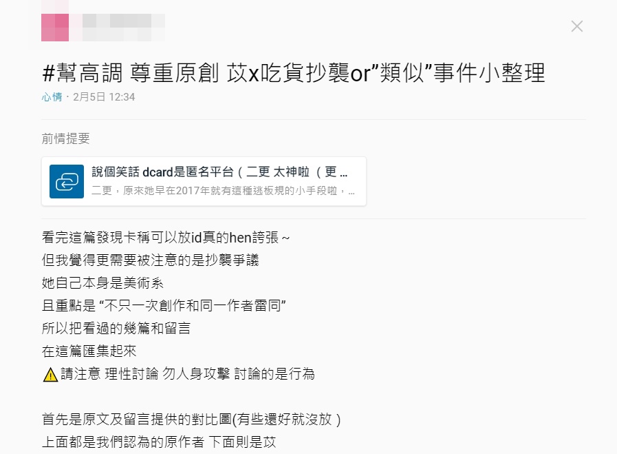 日前有網友在Dcard發文,整理出「鐘苡綾」作品抄襲、類似的事件,內文中貼有許多張比對圖,其中可以看到包括底片、泡泡浴、三色豆、餅乾胸部等,都與國外一名創作者十分相似!另外也有人整理出時間軸,只見鐘苡綾幾乎都比對方晚貼出同素材的作品,因此原PO也在文末表示,「請尊重原作!就算要使用一樣的媒材也請先經過原作同意,在發表創作時也將原作標註註明那是靈感來源,而不是每次都一句art by me!我想這樣爭議會少很多」。
