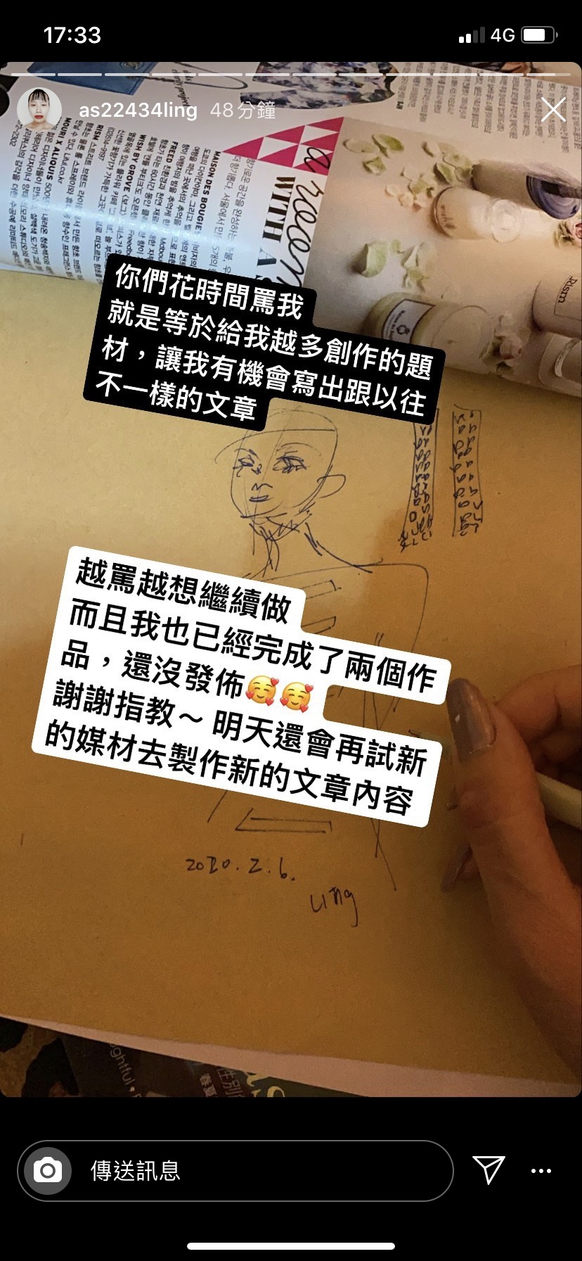 素材撞到歪?!模特兒「鐘苡綾Ling」經常在社群平台分享自己的藝術創作照片,別有創意的照片風格,令她粉絲數不少。不過近日卻有網友在Dcard上指出,鐘苡綾的作品當中有抄襲的現象,瞬間引起一番討論。對此,鐘苡綾也在IG上回覆,「你們花時間罵我,就是等於給我越多創作的題材!」。
