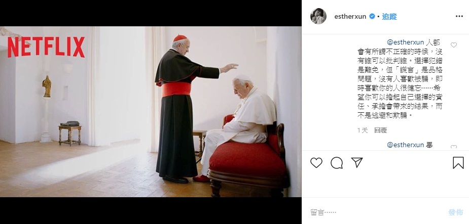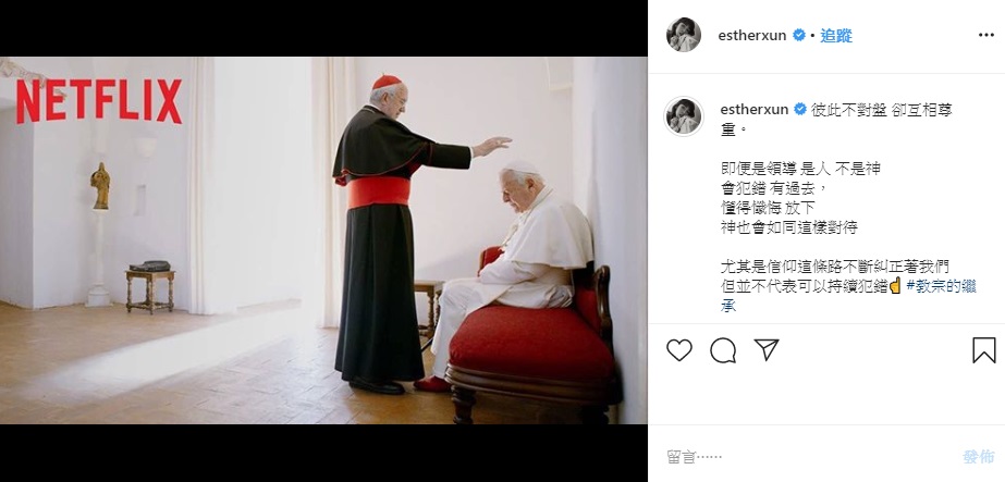 小薰最近在IG發了一篇自己看完Netflix戲劇《教宗的承繼》的心得,她非常有感而發的寫道,「彼此不對盤卻互相尊重。即便是領導,是人,不是神!會犯錯,有過去,懂得懺悔、放下,神也會如同這樣對待!尤其是信仰這條路不斷糾正著我們,但並不代表可以持續犯錯!」
