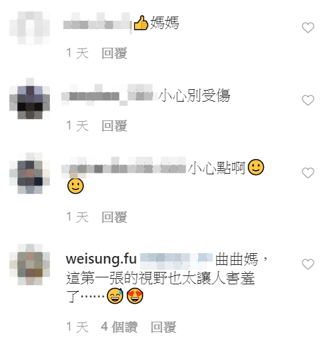 除此之外曲羿還透露自己在玩叢林飛索的過程中「不小心刮到皮」,也讓大批網友相當擔心,紛紛叮嚀她「要好好照顧身體。」、「小心安全!」、「曲曲腳傷要小心傷口,腳傷記得擦藥和換藥。」、「好好注意好傷口喔~~哈哈,玩的開心。」