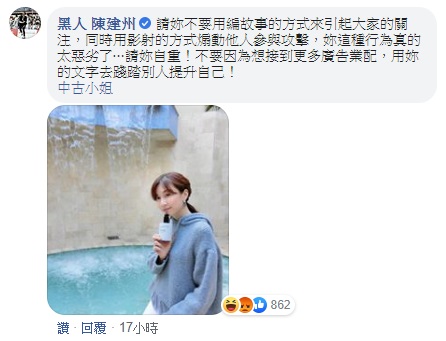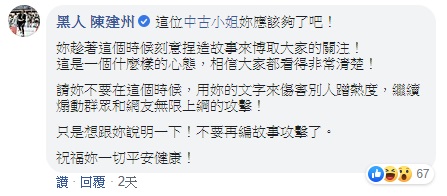 沒想到事隔幾天,黑人5日突然在網紅的貼文底下留言說,「這位中古小姐你應該夠了吧!趁著這個時候刻意捏造故事博取大家關注,這是什麼樣的心態,相信大家看得很清楚!」並且提醒中古小姐,「不要在這時候,用你的文字傷害人、蹭熱度,繼續煽動群眾跟網友來攻擊,只是想跟你說,不要再編故事攻擊!祝你一切平安!」