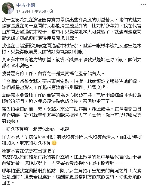 網紅「中古小姐」1月底在臉書發文爆料,自己過去曾跟某女星合作,當時對方到她們公司試裝,兩人本來完全不熟、也根本沒有見過面,沒想到女星竟然「異常」友善的跑過來擁抱她,還說「好久不見!超想念你的~」讓中古小姐瞬間傻眼,認為女星為了拿下中華區千萬代言人的位置,做出這種瘋狂裝熟、巴結的行為,非常無言!