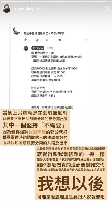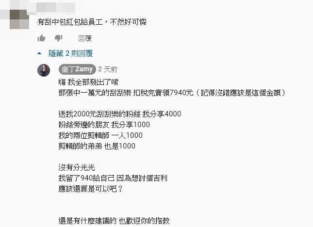 彩蛋中,一名粉絲送了奎丁一張2000元的刮刮樂,最終刮出一萬元獎金,令奎丁非常開心,不過彩蛋也到此結束,因此有不少網友留言,紛紛想得知最後錢怎麼處理?而奎丁也現身回覆表示,「一萬扣稅完約有7940元,送刮刮樂的粉絲分享四千,粉絲的朋友也有一千,兩位剪輯師各一千,剪輯師的弟弟也有一千,自己則留900多塊討個吉利」同時奎丁也謝謝網友們給的建議,歡迎大家提出指教。