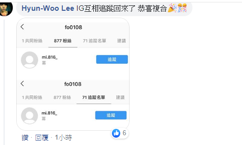 FOFO和葉久馨的感情風波引發極高討論,更有網友貼出截圖顯示「葉久馨和FOFO的IG重新互相關注」,指出原本已分手的兩人似乎又再次復合,急轉直下的事件發展讓網友們摸不著頭腦,紛紛表示「所以之前討拍是?」、「我第一次看到,把人爆成這樣還能復合的....」、「一個願打,一個願挨。」,還有網友語重心長勸告表示「有些人就是不會變的,有些人領悟的慢,身為旁觀者,希望妳可以如妳所願被好好對待,但如果事與願違,希望妳不要想不開」。