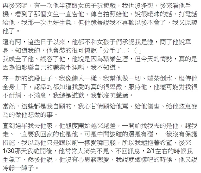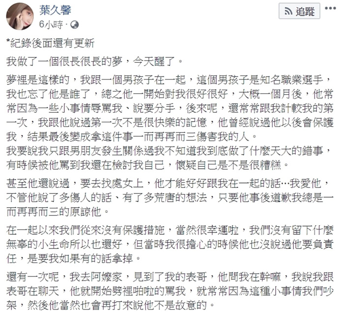 葉久馨先前在FB發文爆料許多和「FOFO」交往期間的不堪細節,表示先前她曾對男方透露自己「第一次」不愉快記憶,然而在之後的交往期間,FOFO多次對她辱罵「不是處女」,甚至表示「要去找處女上」,除此之外更經常對她言語霸凌,讓她一度懷疑「自己是不是做了什麼天大的錯事」,然而FOFO事後卻又會主動認錯,這樣的過程不斷反覆循環,FOFO甚至連她在奶奶家和表哥說話都要大發雷霆,然而自己卻私下和許多女孩子有著曖昧不清的關係,被她發現後兩人多次吵架,最終關係愈來愈冷淡而分手。
