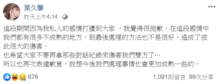 葉久馨的貼文原本令網友相當心疼,然而近日她卻再度貼文聲明表示「這段期間因為我私人的感情打擾到大家 ,我覺得很抱歉,在這段感情中我們都有很多不成熟的地方,到最後處理的方法也不是很好,造成了彼此很大的傷害。」並將原本貼出的爆料貼文,以及許多對話紀錄和錄音證據全數刪除,同時寫道「希望大家不要再拿那些對話紀錄來傷害我們雙方了⋯所以也再次表達歉意,我想今後我們處理事情也會更加成熟一些的。」