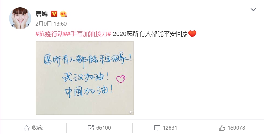 日前唐嫣終於在微博發文,參與並標記「手寫加油接力」抗疫行動tag,寫下:「2020願所有人都能平安回家❤」,同時曬出一張手寫信,上面寫道:「願所有人都能平安回家!武漢加油!中國加油!」,不過仍舊沒有直接回應生產消息,讓網友們紛紛猜測她此舉是不想讓個人私事影響到目前武漢肺炎的疫情焦點。
