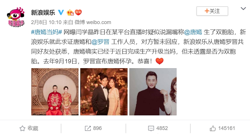 唐嫣宣布懷孕後,鮮少出現在螢光幕前,專心休養準備迎接新生命的到來,然而據陸媒報導,日前微博上瘋傳一則消息,指出唐嫣和羅晉的共同好友透露,她已經在近日生產,順利升格當媽,羅晉的好友「閆學晶」更在直播時不小心說漏嘴,表示唐嫣生的是「龍鳳胎」,除此之外一張疑似羅晉發文「感謝老婆大人」的截圖更在網路上瘋傳,造成網友熱議。