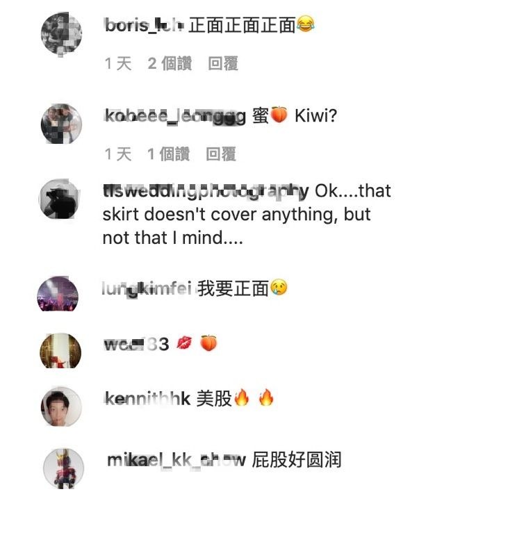 程美段在昨日(9)發出一張超大尺度的自拍照,畫面中她穿著一件連身的細肩背心,下擺的區域僅僅只到腰部,而程美段微微側身並對著鏡子自拍,往下一看她的渾圓蜜桃全都外露,看上去像是沒穿內褲,就有網友留言詢問她怎麼不穿褲子,而她也大方回應:「有 高叉only」,但在照片中看上去就像是沒穿一樣,連丁字褲的細線都看不見。對此網友也在留言區中暴動表示:「正面正面正面」、「蜜桃kiwi?」、「Ok....that skirt doesn't cover anything」、「我要正面」、「屁股好圓潤」。