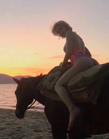 近來,在東南亞忙於工作的DJ Soda,8日時,抵達了馬來西亞的檳城,也曬出自己遊玩的「騎馬」影片。影片中,DJ Soda穿著一身桃粉色的比基尼,在夕陽西下時,騎著馬享受海邊的風情,不過因為布料很少,加上剪裁特殊,布料直接深入她的屁股溝中,完全蓋不住她豐滿的蜜桃臀,讓她整個「背後風光」完全曝光,辣翻一群粉絲。