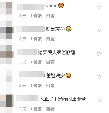 蕾菈照片一出,瞬間引起轟動,粉絲們紛紛按讚留言,「精神都來了」、「這樣是要怎麼睡得著==」、「畫面太美不敢看」、「糟糕不用睡了啦」、「這要讓人家怎麼睡」、「太正了!滿滿的正能量」、「看到這個都醒了」、「睡前不能看這些東西啦!!!」。