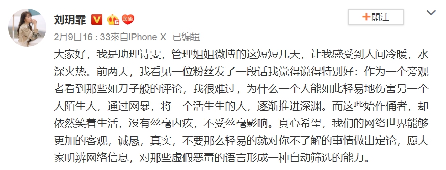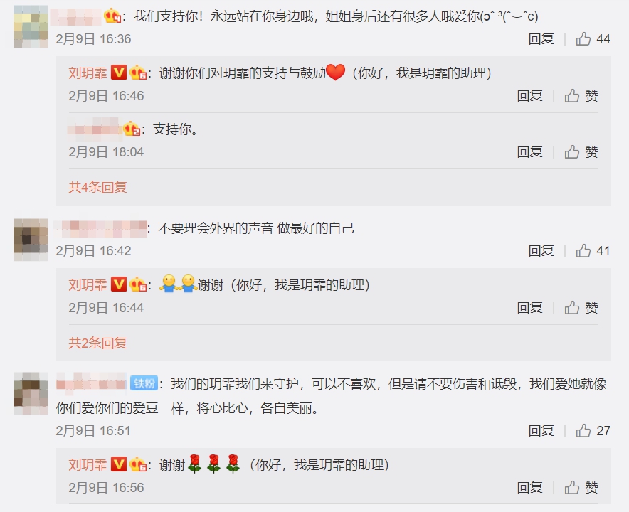 助理長文在劉玥霏微博公開後,眾多粉絲紛紛湧入加油打氣,「支持姐姐,這麼多年看著姐姐,真心不容易!希望姐姐能被溫柔以待!」、「你知道的,我們會一直在你身後。」、「我們支持你!永遠站在你身邊哦,姐姐身後還有很多人哦愛你。」、「不要理會外界的聲音,做最好的自己。」、「人生不過如此,且行且珍惜,一定要記住,你永遠是自己的主角,姐姐加油。」