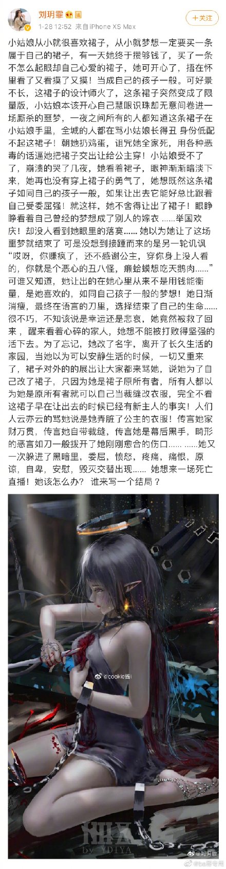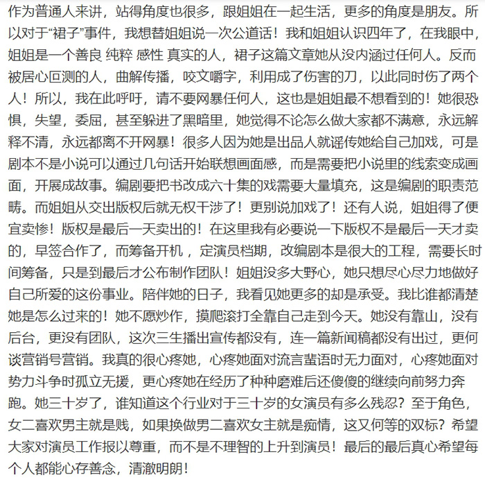 除了演員身分外,劉玥霏作為出品人之一,開播後仍舊被多次指責「加戲」,對此劉玥霏助理日前以她的微博帳號發文,表示劉玥霏寫「裙子事件」從未暗指任何人,反而被居心叵測的人,曲解傳播,咬文嚼字,「利用成了傷害的刀」,「她很恐懼,失望,委屈,甚至躲進了黑暗裡,她覺得不論怎麼做大家都不滿意,永遠解釋不清,永遠都離不開網暴!」,更表示「女二喜歡男主就是賤,如果換做男二喜歡女主就是癡情,這又何等的雙重標準?」呼籲網友對演員工作報以尊重。