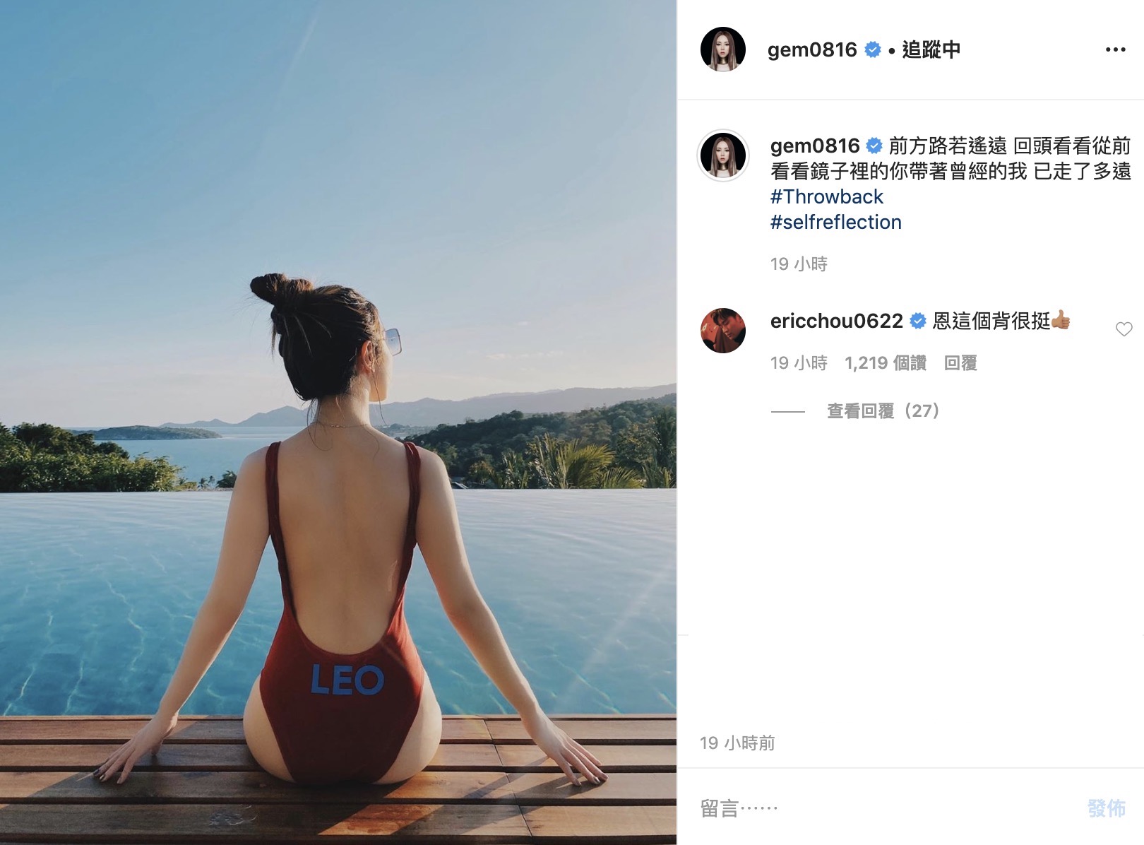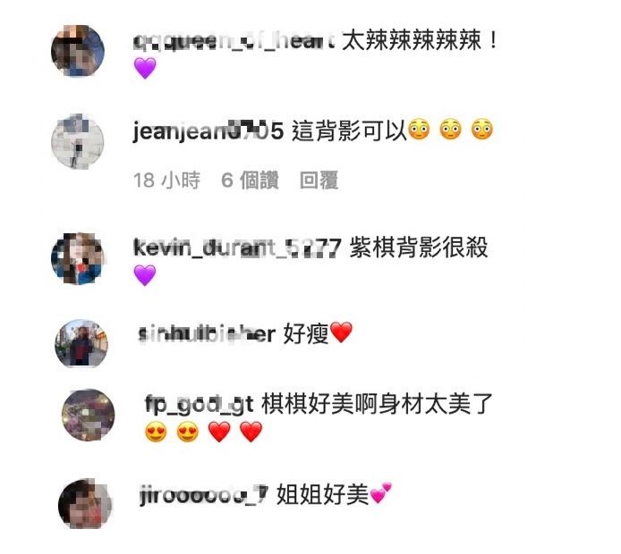 然而看見鄧紫棋曬出美背照後,粉絲們也紛紛留言:「太辣辣辣辣辣!」、「美背」、「好瘦」、「姐姐好美」、「紫棋背影很殺」、「這背影可以」、「棋棋好美啊身材太美了」,就連小天王周興哲也前來留言:「恩這個背很挺」,而鄧紫棋的造型師男友Mark也前來留言:「Sun’s out, buns out」,近幾年來鄧紫棋也一直維持著健康的好身材,不論是連身泳衣亦或者是露腰露腿的造型都難不倒她。