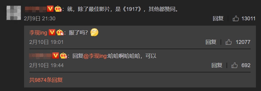 奧斯卡得獎名單在昨日出爐後,竟和李現的預測名單重疊率高達90%,除了最佳導演以外,其他全部猜中!讓網友超驚奇,紛紛狂呼「電影博主明年繼續90%。」、「安利這個電影博主!!!」、「這眼光和審美絕了,希望李現本人以後的電影之路越來越好。」、「建議李現以後加入考研屆,參與考研押題預測。」李現也在微博回覆網友,「服了嗎?」看得出對於心儀的電影得獎也相當開心。
