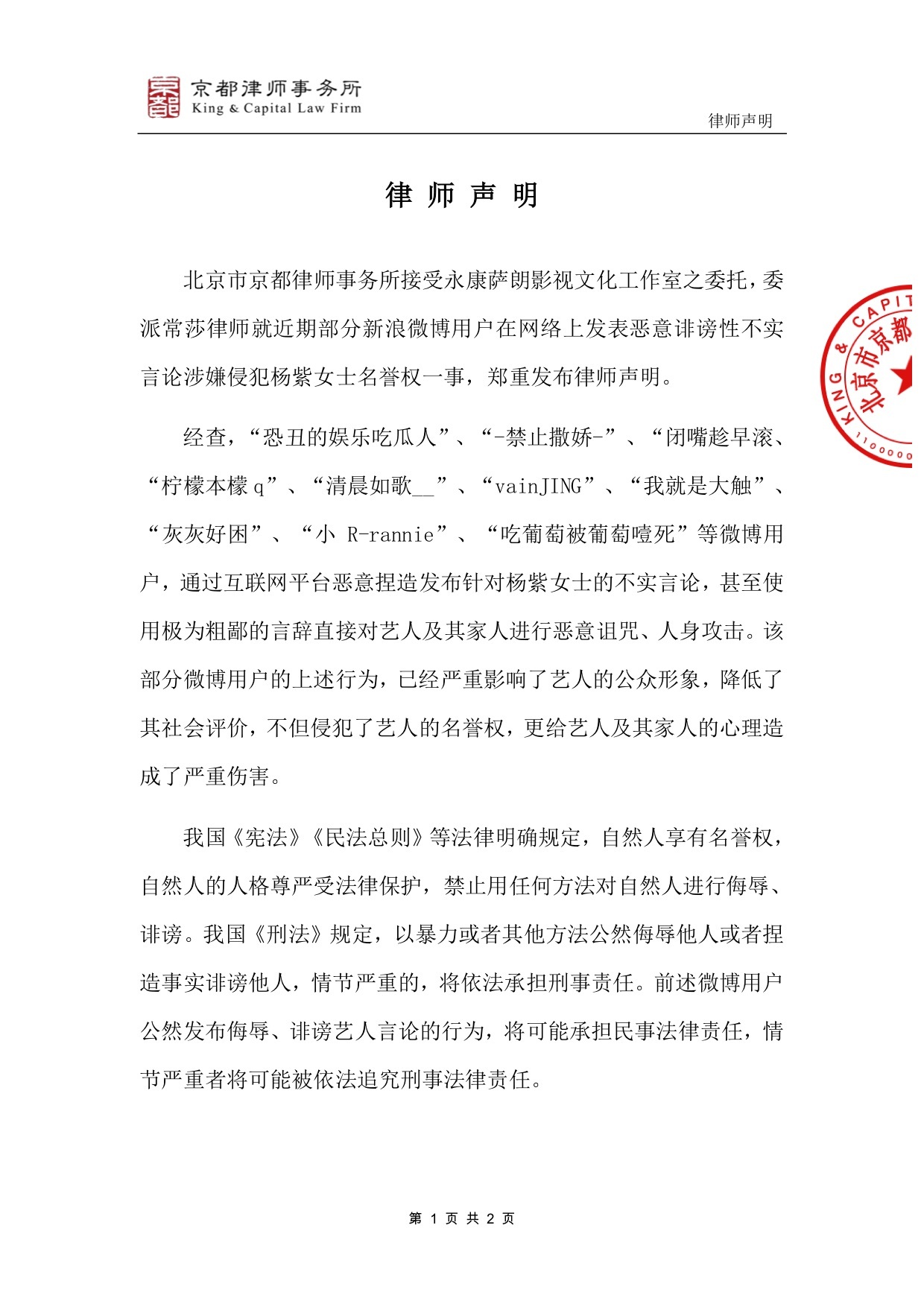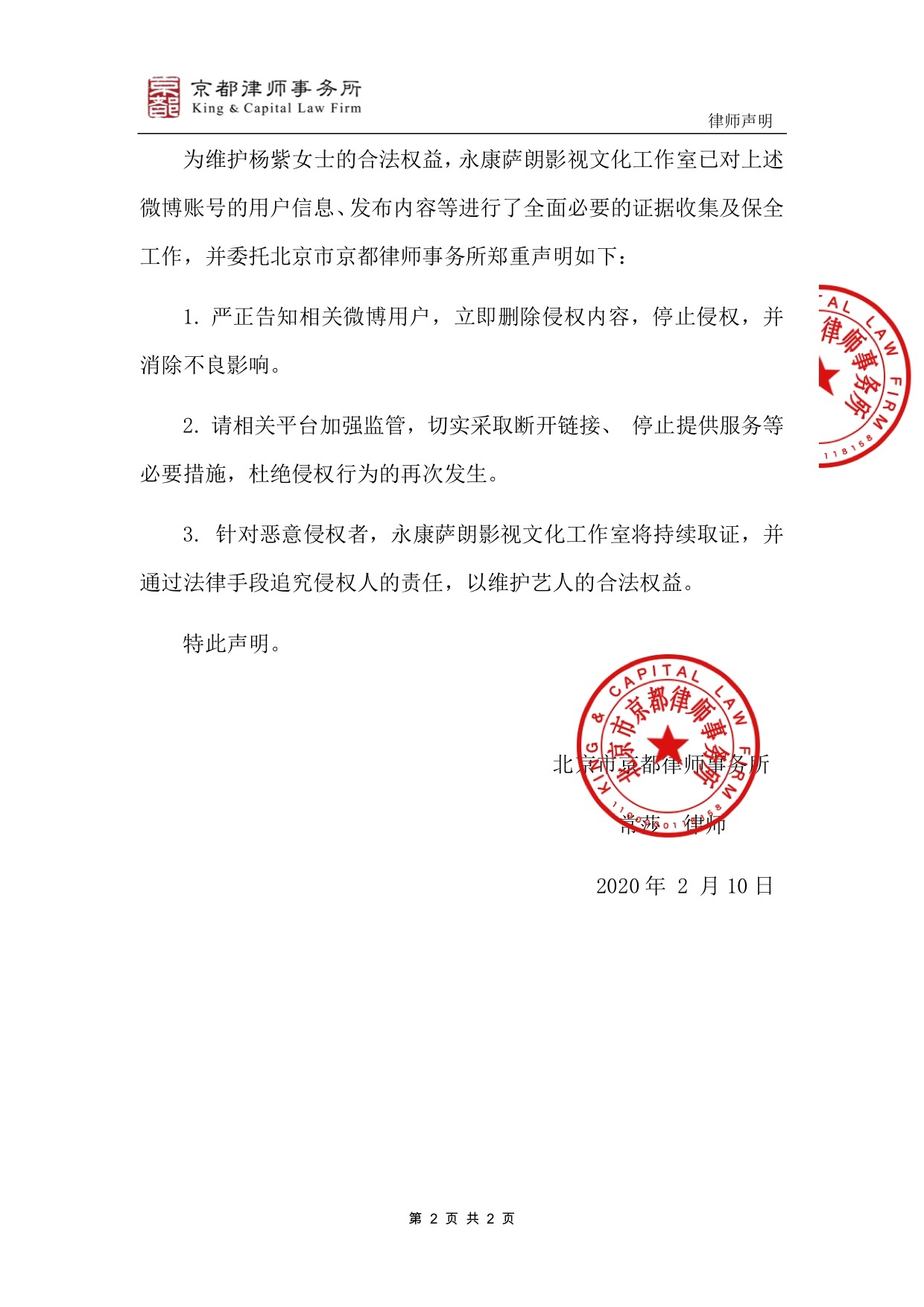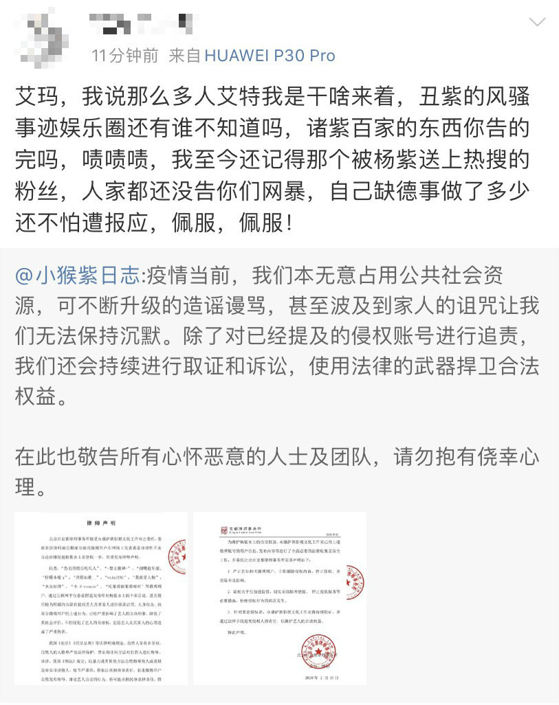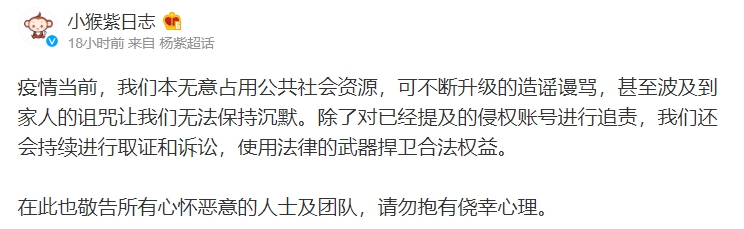 近日,楊紫工作室「小猴紫日誌」在微博上宣布「疫情當前,我們本無意佔用公共社會資源,可不斷升級的造謠謾駡,甚至波及到家人的詛咒讓我們無法保持沉默。」,表示要提告網路上怒罵楊紫的微博公開帳號,且強調他們持續蒐證中,請心懷不軌的網友們「請勿抱有僥倖心理」,同時附上北京市京都律師事務所的聲明,鐵了心槓上酸民!