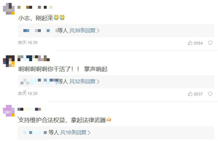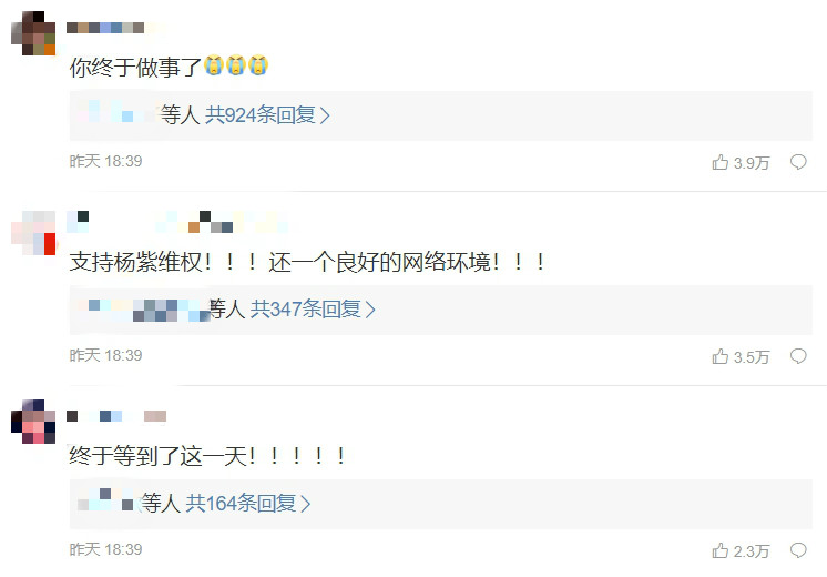 楊紫粉絲們見狀直呼大快人心,紛紛在貼文底下留言「支持用法律武器捍衛合法權益!黑子太過分了!」、「不許私了!不許向(像)上次一樣道歉就完事!給我往死裡告!」、「終於等到了這一天!」,同時更有不少網友直酸「你終於做事了」、「小誌,剛起來」、「你幹活了!掌聲響起」