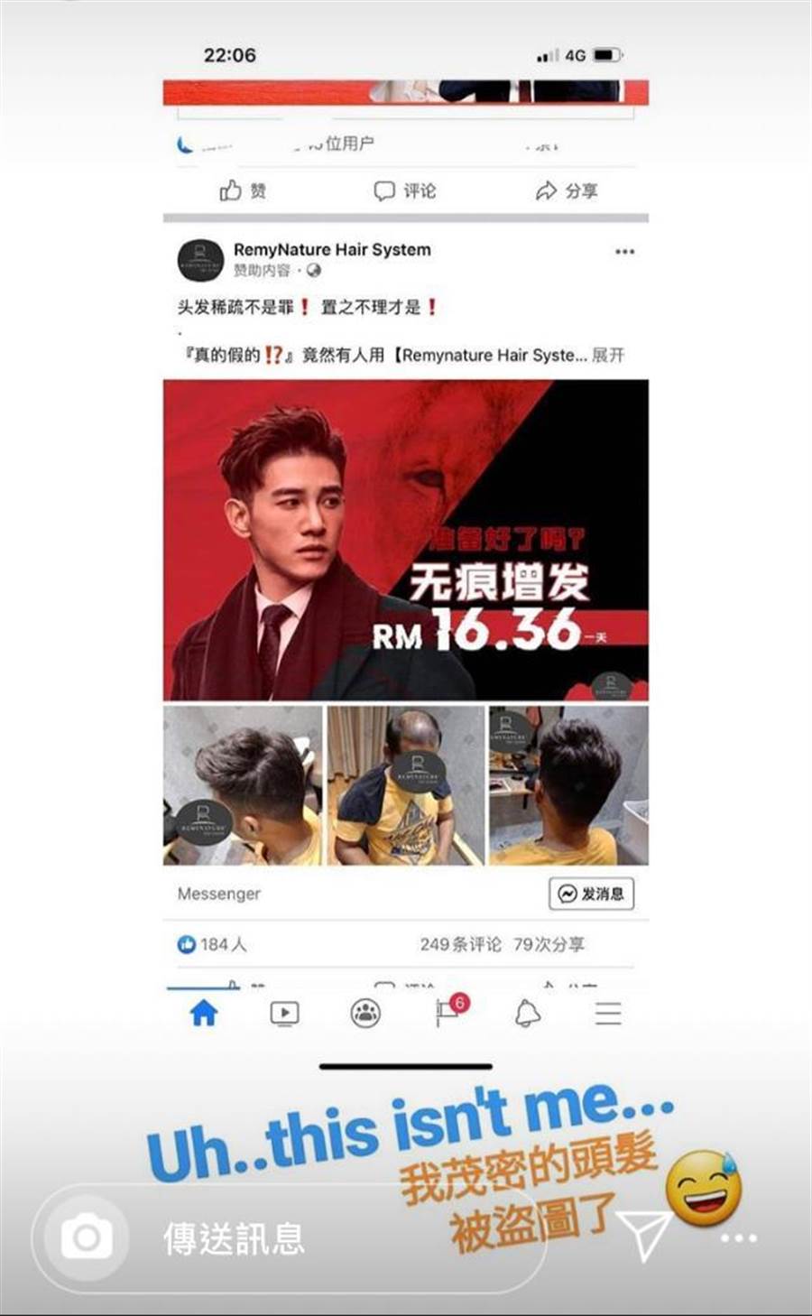 張立昂日前在Instagram限時動態貼出一張在臉書上的截圖,原來是他的照片竟然被網路上的不肖商家盜用,移花接木做成增髮廣告,只見貼文上還寫著「頭髮稀疏不是罪!置之不理才是!」更打上大大的「無痕增髮」字樣,讓他傻眼趕緊澄清:「Uh..this isn’t me ….我茂密的頭髮被盜圖了。」希望粉絲不要因此受騙。
