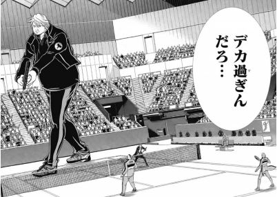 為什麼突然會有這麼巨大的選手呢?原來《新網球王子》最新一話在描述日本代表隊遭遇了德國隊,為了突顯歐洲人比亞洲人還要高大壯碩的體型,其中一名德國選手就以下面這個驚人的體型登場,令日本選手不禁感嘆:「這也太高大了吧...」