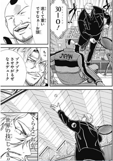 不過就在最新一期的連載雜誌發售之後,觀看了全新一話《新網球王子》劇情的漫畫迷立刻噴飯分享下面的驚人畫面,日本代表隊居然遭遇了史無前例的巨人對手,這簡直比之前「騎馬打網球」還要更扯,火速引發近 27 萬網友狂讚並爆笑轉發。