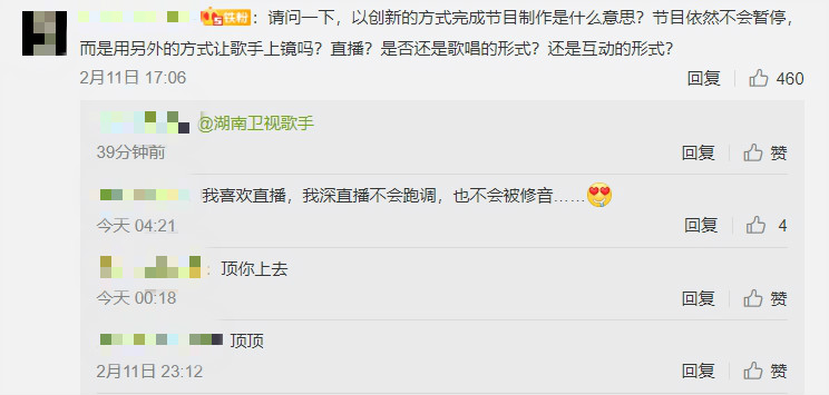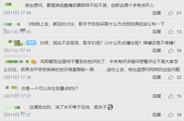 消息一出引起網友熱烈討論,有網友提出針對「創新方法完成節目錄製」提出質疑,表示「以創新的方式完成節目製作是什麼意思?節目依然不會暫停,而是用另外的方式讓歌手上鏡嗎?直播?是否還是歌唱的形式?還是互動的形式?」,不少網友紛紛附和「對呀,觀眾不去現場,歌手們呢?以什麼形式播出呢?停播還是不停播?」、「終於在一堆控評裡找到一個正常評論了」,更網友怒批「要是換成直播投票那樣不如不錄」。