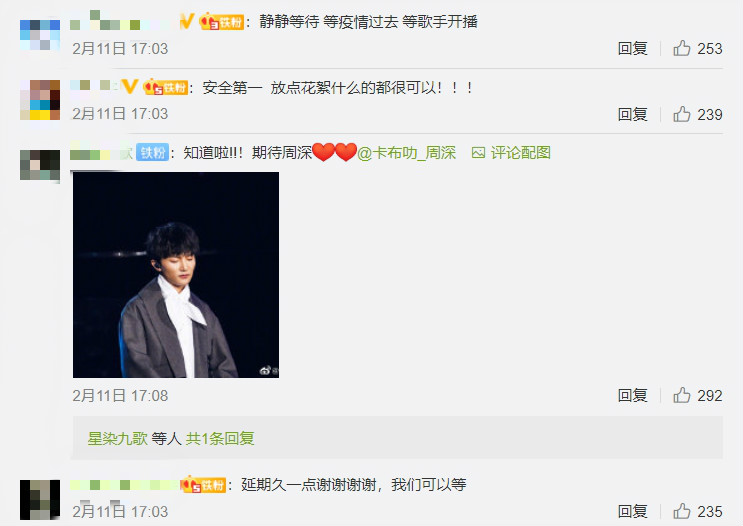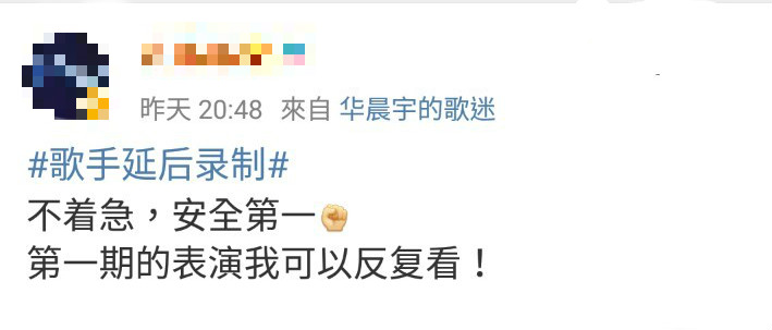 同時,也有不少粉絲眼看肺炎疫情嚴重,暖心力挺支持「靜靜等待、等疫情過去、等歌手開播」、「安全第一,放點花絮什麼的都很可以!」、「延期久一點謝謝謝謝,我們可以等」、「不著急,安全第一,第一期的表演我可以反覆看!」。雖然錄製延期,但官方仍釋出下一期節目預告,看來仍會如期播出,針對網友的評論與疑問,官方尚未做出回應。