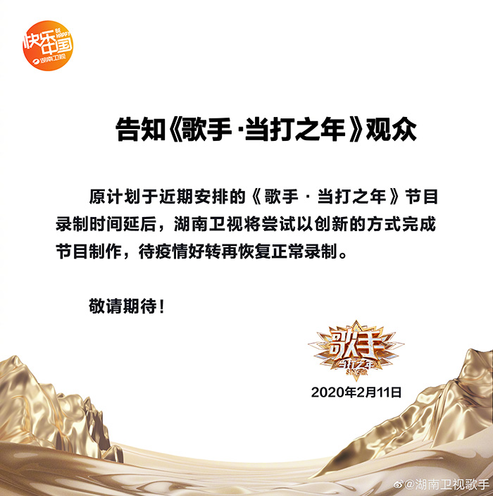 《歌手2020》在開播之前就掀起網友熱烈議論,首發歌手驚見華晨宇、MISIA米希亞、蕭敬騰、徐佳瑩、袁婭維、毛不易和周深七位歌手,名單曝光造成網路轟動,第一期播出後全國網城域收視率「破1」,吸引了無數觀眾的目光,不料,近日官方在微博上宣布「原計畫於近期安排的《歌手‧當打之年》節目錄製時間延後,湖南衛視將嘗試以創新的方式完成節目錄製,待疫情好轉再恢復正常錄製」,瞬間激起網友轟動,「歌手延後錄製」關鍵字瞬間登上微博熱搜排行榜。