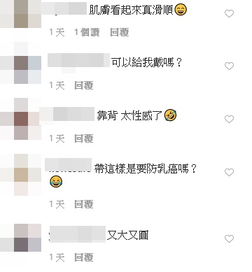 星諠照片一出,口罩再利用的辦法立刻獲得大眾好評,網友紛紛留言表示,「肌膚看起來真滑順」、「太辣」、「帶這樣是要防乳癌嗎XD?」、「流鼻血了」、「妳的口罩給我吧」、「太兇狠了」、「這個有梗,那用過的奶罩呢?」。