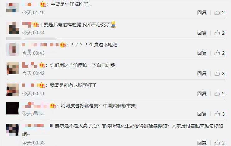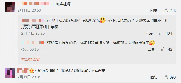 貼文一出立刻掀起網友熱烈議論,這位原PO反被大部分網友怒轟「關你屁事」、「這TM都算粗?我覺得我腿這樣我還挺自豪」、「這叫粗,喔那我是大象腿無疑」、「wtf現在大家標準這麼高?」、「要是我有這樣的腿,我都開心死了」、「要求是不是太高了點?」、「你們用這個角度拍一下自己的腿,我要是能有這腿就好了」,同時,也有持不同意見的網友表示「確實粗阿」、「主要是土」、「腿短吧,看起來比例一般的樣子」。