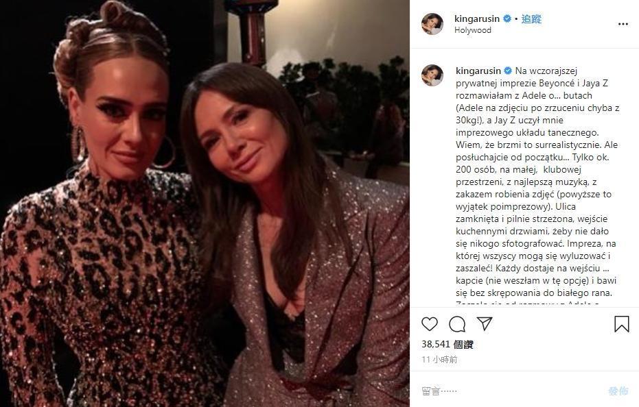 今年的奧斯卡頒獎典禮剛剛落幕,愛黛兒日前出席會後由碧昂絲與傑斯(Beyoncé & Jay-Z)夫婦主辦的慶功派對時,波瀾電視節目主持人魯辛(Kinga Rusin)在IG放上與愛黛兒的合照,穿著緊身豹紋上衣的愛黛兒盤起一頭長髮,清瘦的身形更加明顯,也令魯辛不禁驚呼:「我一開始沒認出來是愛黛兒,因為她真的太瘦了!」