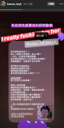 Keanna去年大義滅親檢舉老公謝和弦呼麻,隨即陷入謝和弦和直播主莉婭的感情風波中,三個人的愛恨情仇鬧得沸沸揚揚,謝和弦還沒離婚就頻頻和莉婭在社群平台上高調放閃,並屢次聯手攻擊Keanna,她面對還未離婚的老公和小三兩面夾擊,處境令許多人都相當心疼。日前好友梁云菲就在限時動態上替Keanna出氣,怒罵「別人的老公比較香嗎?」