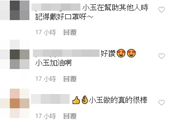 小玉行善照片發出後,引來不少網友按讚,紛紛留言表示,「小玉太棒,有點感動」、「謝謝小玉幫助遊民!小玉也要照顧好自己」、「我才在思考這些流浪者怎麼辦,又買不到口罩幫他們,謝謝你喔!」、「做善事順便呼籲大家不囤貨超讚」、「很棒越來越讚!你有在進步~加油加油」。不過也有人認為,做善事很好,但自己發文反而有點偽善,「有心便足矣」。