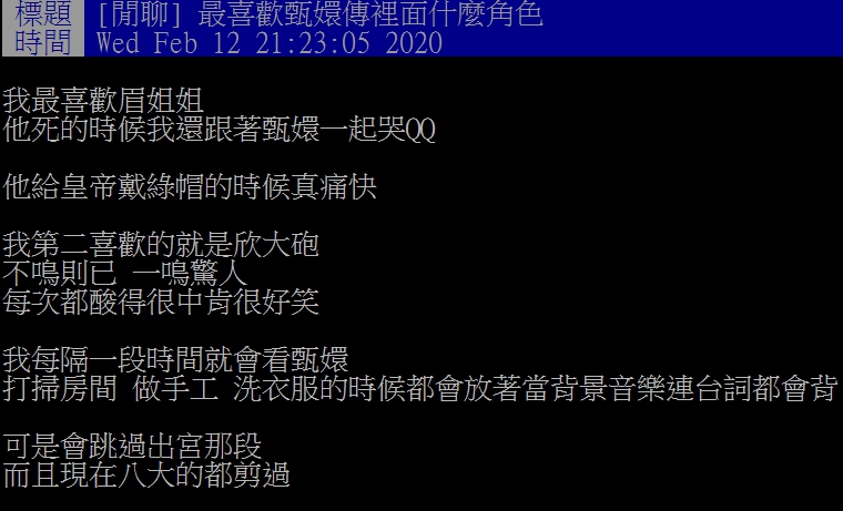 日前有網友在PTT發文,想問問廣大鄉民最喜歡《甄嬛傳》的哪個角色?而原PO也在內文中,提到自己最喜歡的是「沈眉莊」,再來則是「欣大砲(欣嬪)」,原PO大讚欣嬪是不鳴則已,一鳴驚人,每次開酸都酸地恰到好處!另外原PO也提到,自己直到現在都會重複看《甄嬛傳》,是做家事時的最佳背景音樂!