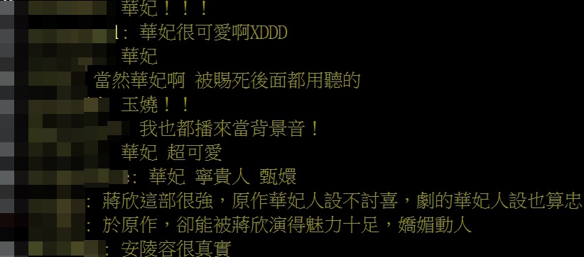 PTT文章一出,立刻引來許多網友討論,紛紛留言自己最喜歡的角色「玉嬈最幸福,有姐姐幫忙坦,還可以跟心愛的人過一生」、「葉蘭依+1,華妃我也喜歡」、「華妃被蔣欣演得魅力十足,嬌媚動人、「絕對是華妃」、「華妃很美,而且他是唯一一個從頭到尾都愛皇上的人」、「華妃,整部最真實的人物」、「沈眉莊+1,喜歡她的個性而且最耐看」。在留言當中,華妃被提起的次數最多,雖然在劇中是反派角色,但他敢愛敢恨,個性鮮明,難怪成為大家的心頭所好!