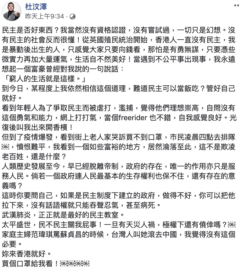 黃秋生轉發文章酸了范瑋琪之後,杜汶澤也轉發了貼文再次解釋自己是針對極權開火,並非針對范瑋琪一人,在半個月前發生的口罩風波仍持續延燒。