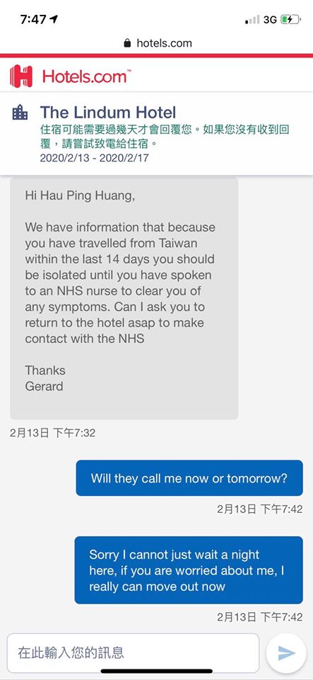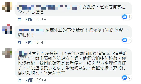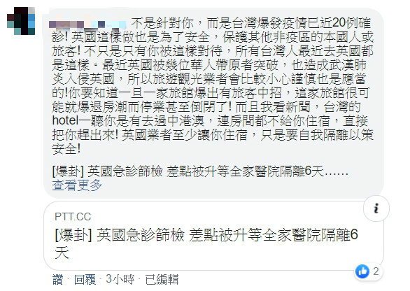 消息一出引起網友熱烈議論,有網友感嘆「平安就好,這波疫情實在令人人心惶惶」、「在國外真的平安就好!」、「這已經算是種族歧視了吧」、「就是想賺你14天住宿費」,同時也有網友表示「不是針對你,英國這樣做也是為了安全,保護其他非疫區的本國人或旅客!」,表示如果真的不幸有帶原者出現,不只當地的觀光產業會受到衝擊,這家飯店更可能會「停業甚至倒閉」,所以業者會比較小心謹慎也是在情理之內。